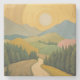 This serene landscape painting depicts a winding path leading through a lush, verdant valley toward distant, rolling mountains. The most striking element is a magnificent, radiant sun that dominates the upper half of the canvas, rendered in circular, sweeping brushstrokes of shimmering gold and soft ochre. The foreground is filled with dense, dark green evergreen forests and gentle hills in shades of mustard yellow, moss green, and a singular pop of dusty rose. The overall atmosphere is one of tranquil exploration, combining a folk-art sensibility with a rich, metallic texture that makes the sky appear to glow with eternal light.