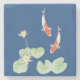 Uma porta copos de pedra com uma pintura de cor de água Zen idílica de dois koi numa lagoa koi com lírios de água branca e almofadas de lírios de água (fundo azul).