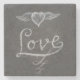 Slate effect on marble stone coaster with love handwritten in chalk and a heart with wings above.
