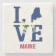Maine State Love. Principal em letra vermelho brilhante maiúscula sans. A palavra amor está preenchida com a bandeira estadual e a letra O apaixonada é moldada na silhueta do estado de Maine.
