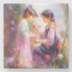 Uma pintura gerada por IA de duas meninas admirando flores em um jardim.