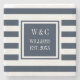Pires de iniciais personalizadas elegantes com um padrão de faixas azuis marinho e branco com suas iniciais e nome da família com a data de estabelecimento definida em um quadrado com borda azul marinho e texto branco clássico. Criado por Thisisnotme©