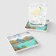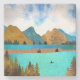 Uma paisagem de abstrato com texturas únicas mostrando uma montanha e uma cena de lago com um barco a remo solitário e um nascer do sol espantoso e raios solares em tons de azul, lacre, ciano e ouro.
