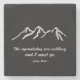 Caracterizando uma montanha original projete a silhueta que os olhares como as montanhas são cobertos na neve, sobre um fundo preto, e nas citações populares do naturalista John Muir: "As montanhas estão chamando e eu devo ir." está embaixo. Não há nada como a caminhada, o alpinismo ou "apenas estar", nas montanhas.