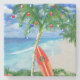 Férias felizes das praias arenosas quentes do seu favorito destino tropical. Palmeira decorada com enfeites de Natal e luzes, com uma prancha de surf retrô encostada na árvore de Natal.