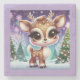 A sweet little reindeer sparkles under a snowy night sky, surrounded by frosted evergreens and twinkling lights. Her gentle expression and soft, glowing colors capture the pure innocence and warmth of the holiday season. A dreamy and heartwarming Christmas scene!