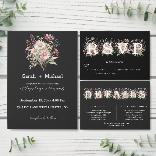 Black and White Spring Floral Wedding Invitation Criado por Phyllis Waugh