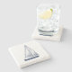 Um trivet com um tema náutico original. Caracteriza um veleiro centrado no meio em um marinho vibrante e em um esquema de cores branco.