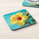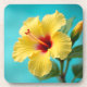 Um belo hibisco amarelo, simbolizando a luz do sol e a felicidade, contra um fundo turquesa. As pétalas se curvam suavemente para fora, enfatizando seu encanto tropical.