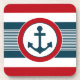 Design náutico com decoração em forma redonda com âncora sobre fundo listrado a azul, vermelho e branco