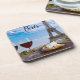 Dois copos de vinho tinto com salgadinhos com vista a Paris e à torre Eiffel. Vidro de vinho tinto com diferentes aperitivos - prato com presunto, fatiado, queijo azul. Casal, celebração romântica. Café com vista.