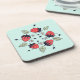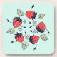 Porta copos de morangos brancos com uma ilustração vetorial que representa 5 caracteres de morango felizes sorridentes dançando em um círculo rodeado por folhas e flores da sua própria espécie. Design divertida com espírito primavera para uma pessoa que ama essas frutas deliciosas.