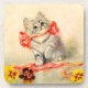 Portas copos com o trabalho de arte de Kitten de Meta Plückebaum com um Friso Vermelho (b. 1876). Uma gatinha cinza com listras escuras é lindamente adornada com uma fita vermelha. O gatinho brinca com uma abelha. Flores amarelas decoram o primeiro plano. Um presente maravilhoso para amantes de gatos e entusiastas de arte alemães!