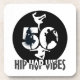 Hip Hop Vibes. Durante 50 anos no Hip hop A imagem apresenta um design preto e branco com o número "50" exibido de forma destacada no centro. O número é formado por três silhuetas de dançarinos, cada um executando um movimento diferente de hip hop. Os dançarinos são posicionados de forma dinâmica, criando um sentido de energia e movimento. Abaixo do número, a frase "VIBES HIP HOP" é escrita em negrito, em letras negras. O fundo é um círculo negro, que adiciona um sentido de profundidade e contraste ao design. A imagem global é atraente para os olhos e visualmente atraente, e transmite efetivamente o tema da cultura do hip hop.