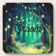 Um casamento, noivado ou aniversário numa bela noite, com um caminho florestal adornado com luzes de fada nas árvores, criando um cenário deslumbrante. Uma névoa suave paira ao fundo da floresta, com inúmeras árvores e luzes penduradas graciosamente em seus galhos.