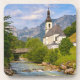 Porta copos de fotos plásticas com uma paisagem com uma igreja ao lado de um riacho montanhoso com montanhas ao fundo dos Alpes em um dia de verão em Ramsau bei Berchtesgaden na Baviera, Alemanha, ao lado da fronteira com a Áustria.