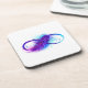 Símbolo infinito com uma bela pena pintada em cores roxas e azuis brilhantes sobre fundo branco.