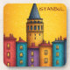 A vibrant city skyline featuring colorful buildings and a historic tower inspried by the city of Istanbul, Turkiye against a warm sunset background.
