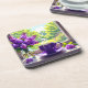 Uma porta copos bonito com uma ilustração linda de lilases roxas vibrantes sentados em um vaso de vidro, junto a uma xícara de vapor de café quente em um dia brilhante de verão.