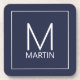 O design moderno minimalista apresenta um monograma personalizado e o nome no estilo de fonte branco moderno sans serif em fundo azul marinho.