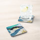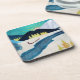 Uma paisagem digital com cores brilhantes e texturas mostrando um cogumelo com uma equipe de trenó de cão e um sol cor-de-rosa brilhante em tons de azul, ouro, ciano e amarelo.
