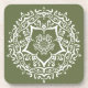 Esta mandala branca senta-se sobre um musgo escuro ou fundo verde-oliva. As cores são harmoniosas e equilibradas. Parte da Coleção Jarn Mandala.