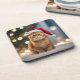 Um gato exótico e bonito de gengibre de shorthair vestindo um chapéu de Papai Noel.