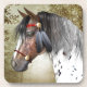 Trabalho de arte original digital de Jayne Wilson apresenta um retrato frontal de um Pôneo Índio Appaloosa em uma ponte vermelha, com sotaques e penas ouros.