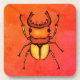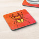 Porta copos de escaravelho laranja vibrante com uma ilustração artística representando um escaravelho com grandes galhadas com elementos decorativos em cores amarelo e laranja divertidas sobre fundo rosa doce. Presente de entomologia de excelente para uma garota interessada em insetos.