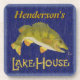 Este grupo da porta copos da bebida é perfeito para sua decoração da casa do lago. Mostra um desenho original de um peixe baixo aproximadamente para morder um gancho. O texto diz, "[a casa do lago seu name]." O design é feito nas máscaras de azul, de verde, de amarelo e de marrom e inclui um quadro da onda.