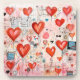 Cork porta copos com um padrão divertido de estilo de mídia mista. Grandes corações vermelhos e várias formas aleatórias espalhadas ao redor do fazer um padrão deliciosamente fofo.