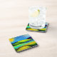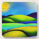 Design de paisagem digital com aquarela em tons vibrantes de azul, verde e amarelo com sol e aves.