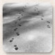 Uma poeira de neve fresca cobrir uma rodovia preta com densidades variadas. Dois conjuntos de impressões de inicialização pretas começam lado a lado na parte superior da imagem e divergem à medida que se aproximam do visualizador nesta fotografia vertical, preta e branca. Um conjunto de faixas sai do canto inferior esquerdo enquanto o outro conjunto de pegadas sai a meio do lado direito do quadro. Fotografia digital, preta e branca. Copyright © 2010 Claire E. Skinner. Todos os direitos reservados.