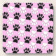 Um padrão em preto e branco de estampas de pata de cachorro com efeitos aflitos em um fundo rosa. Estilo de desenho de design original.