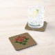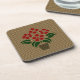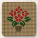 Lindas flores vermelhas com folhas verdes em um vaso marrom sobre uma cesta tecida bege. A tecelagem é gerada por computador e falsa, mas fica legal em algumas coisas!