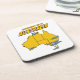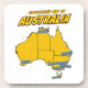 Este mapa ilustrado da Austrália é renderizado em um estilo vibrante de pop. O mapa é esboçado em preto e preenchido com uma cor amarela clara, colocada sobre um fundo azul com um padrão pontilhado. As grandes cidades da Austrália são rotuladas em caixas azuis
