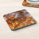 Este conjunto de portas copos decorativas apresenta um padrão geométrico de abstrato de azulejos de mosaico em forma de pentágono em cores brilhantes do outono, de vermelho, laranja, castanho, amarelo, ouro, azul, cinza, preto e branco.