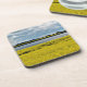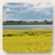 Um campo de canola amarela vibrante floresce sob um céu dinâmico, com manchas de nuvens fluffy lançando sombras na paisagem. Ao fundo, uma banda contrastante de árvores verdes escuras separa o campo de uma extensão tranquila de água. Esta imagem foi tirada perto de Streatham em Victoria, Austrália.