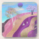 Esta linda paisagem de abstrato retrata uma cena rolante ao lado da colina com primavera e pássaros florescentes em tons de rosa, roxo, bege, bronzeado, ouro, verde e azul.