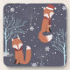 Raposas adoráveis vestidas de bonés vermelhos e cachecóis formadas em uma floresta nevada contra fundo de carvão.