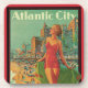 Arte de pôster de viagem vintage dos Estados Unidos da América para Atlantic City, Nova Jersey, via Pennsylvania railroad, apresentando uma bela mulher loira pin-up de biquíni segurando uma toalha olhando para o sol na praia durante o verão. As pessoas estão se divertindo na praia e na passarela. Atlantic City é uma cidade de resort conhecida por seus jogos, compras e restaurantes sofisticados.
