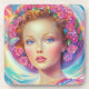 Um retrato de fantasia impressionante de uma mulher adornada com uma coroa vívida e tons pastéis brilhantes. Seus olhos azuis luminosos e sua expressão suave são complementados por uma delicada borboleta e uma aura do arco-íris girando. Esta ilustração assombrosa combina beleza, natureza e elegância surreal.