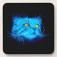 Um rosto de gato azul fraturado com olhos amarelos espantosos contra um fundo preto.