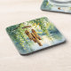 Uma porta copos ilustrando os moinhos de bambu pendurados em uma árvore-salgueira chorando com fundo de lago. Uma cena tranquila e pacífica.
