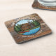 Cute personalized log cabin coasters. A cute cartoon log cabin, pine trees, cabin and lake. IF you have a lake house, log cabin, hunting or fishing cabin then these personalize coasters are a great gift!
