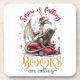 A festive and cheerful Christmas design showcases a dragon in a Santa hat, perched atop a pile of pillows, engrossed in a book. Beside the pillows are Christmas presents and a glowing candle, with golden snowflakes framing the scene. The vibrant text reads, "Snow is falling, books are calling." This design is available on various products, making it a perfect gift for book lovers.