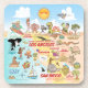Cena brilhante e feliz - uma vista cartoon map do sul da Califórnia - personagens encantadores desfrutam do quente SoCal sun - Los Angeles, San Diego, Anaheim, Papais noeis Barbara, Riverside, Palm Primaveras e El Centro são apresentados - Anza Borrego Desert State Park e Joshua Tree National Park estão incluídos, assim como as cidades fronteiriças de Tijuana, Tecate e Calexico, no México.