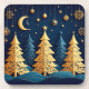 ‘Starlit Tree Dream – Golden Whimsy’ captures the heart of a luminous winter’s night. Five elegant trees—each finely adorned—rise from snow-capped hills to meet a sky alight with celestial ornaments. A crescent moon, radiant stars, and hanging baubles shimmer above, while the contrast of navy and gold evokes a sense of magic and majesty.