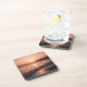 Foto impressionante de um pôr do sol sobre uma praia deserta com montanhas e palmeiras à distância.