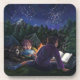 A arte Starry Night de Traci Van Wagoner impressão, posters, acessórios e presentes mostra nossa pintura original de duas crianças e seu grande e negro cão acampando sob as estrelas lendo um livro fantástico ao redor de um fogo no acampamento sobre cavaleiros e dragões. A magia da história está subindo no céu estrelado para mostrar um cavaleiro e um dragão numa dança eterna noturna de estrelas. Aproveite um acampamento noturno de verão nas montanhas.
